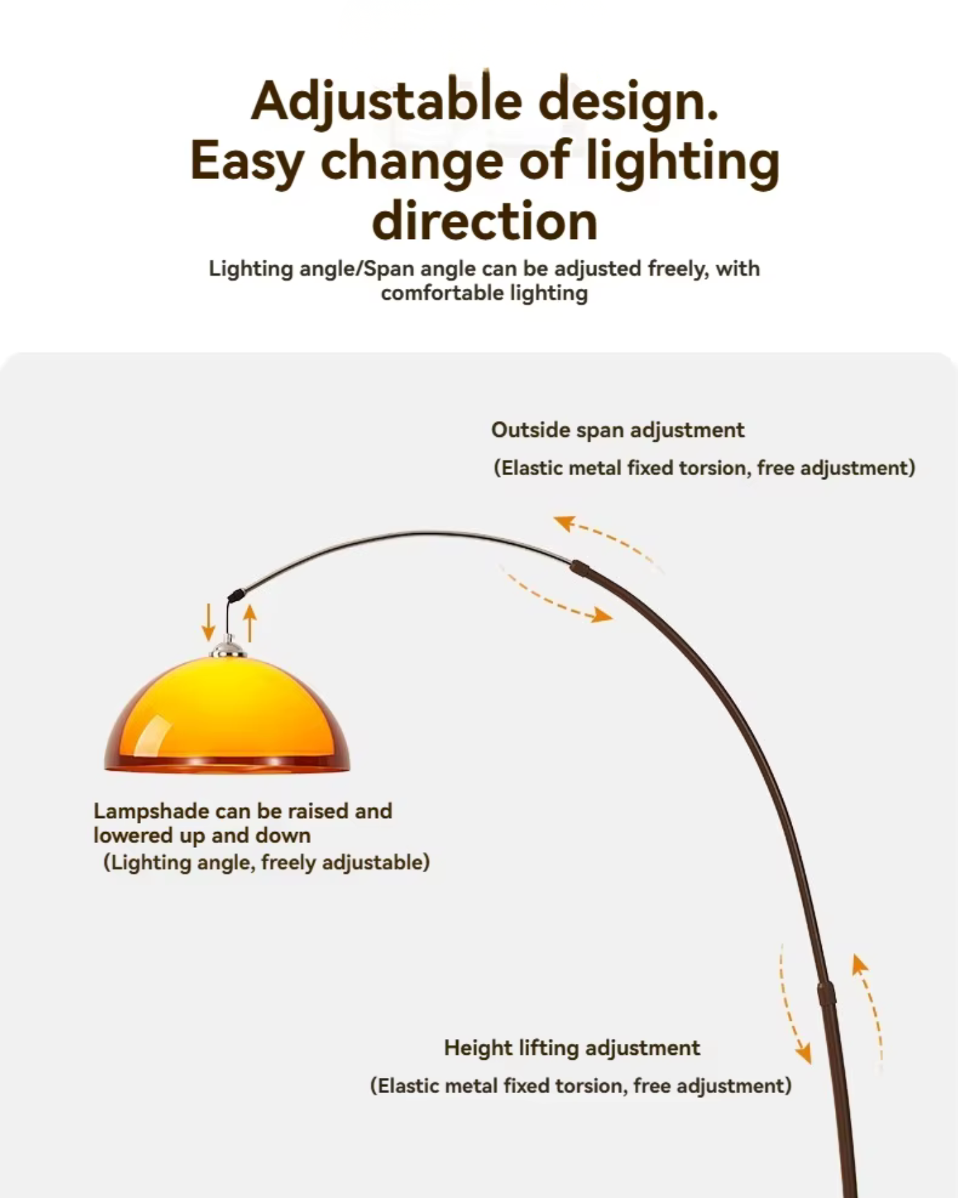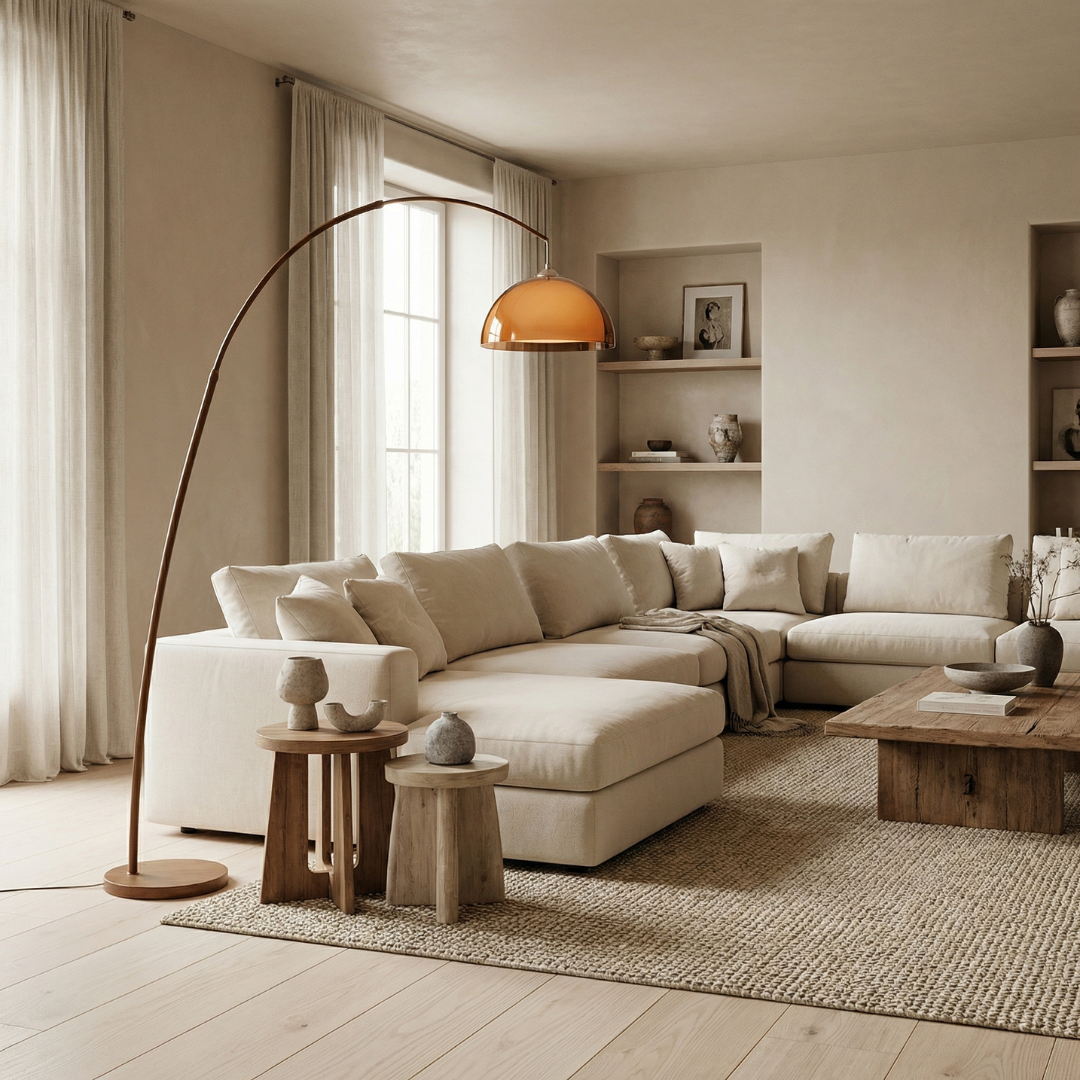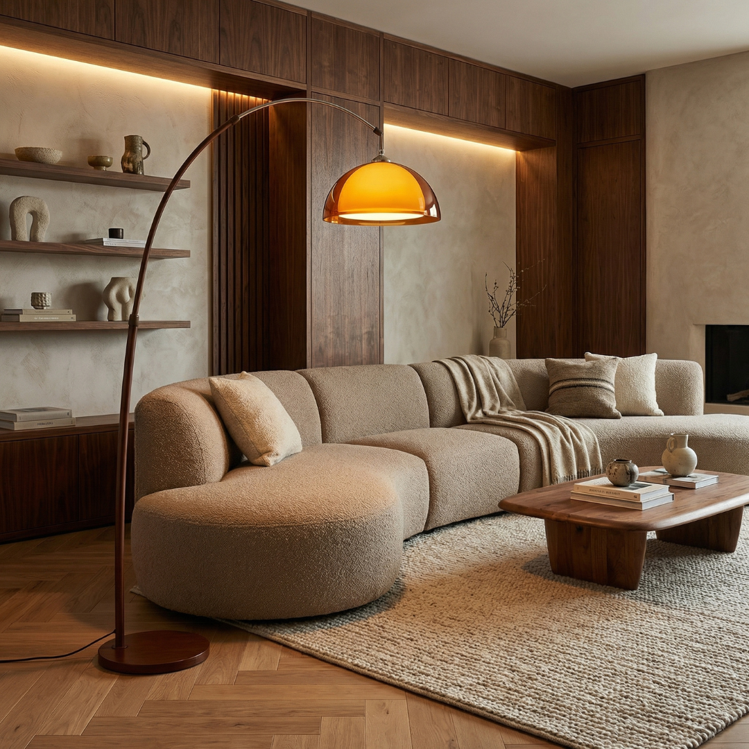 The sweeping arc isn’t just a design choice it shapes how the room feels. Extending gracefully over seating areas, the lamp creates a natural focal point that feels both intentional and effortless, bringing height, flow, and a sense of quiet sophistication into your living space.